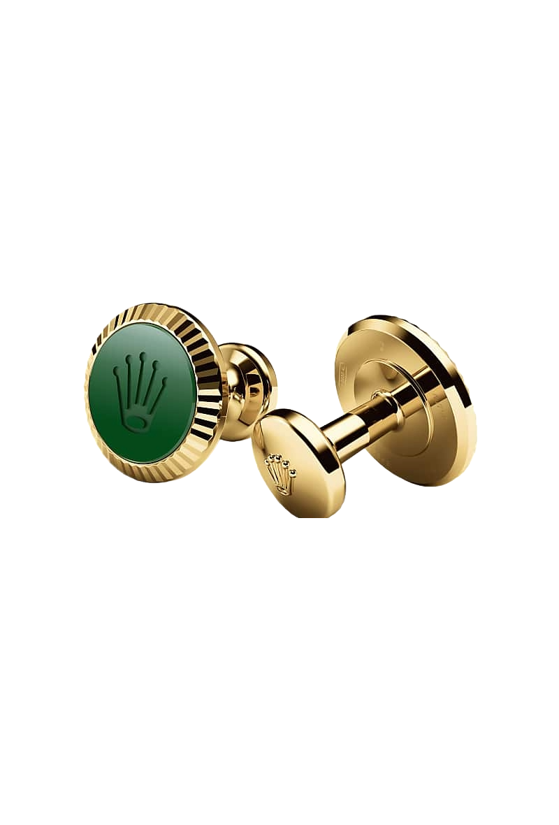 Rolex cufflinks made of 18 kt yellow gold featuring the signature Rolex fluting, Cerachrom insert and Rolex crown.